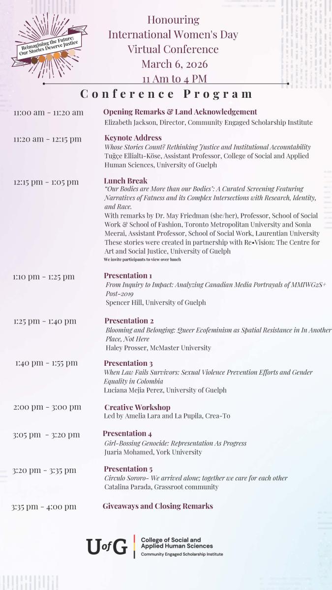 We invite you to attend the 9th annual International Women’s Day Online Conference hosted by the Community Engaged Scholarship Institute at the University of Guelph on Friday, March 6th from 11:00am - 4:00pm! This year, we will have a keynote presentation from Tuğçe Ellialtı-Köse, a creative workshop by creato, and research presentations from student researchers, practitioners and artists from a range of backgrounds and disciplines.